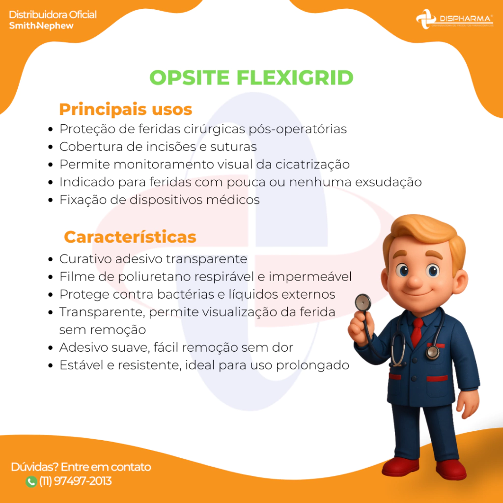 OPSITE* FLEXIGRID é uma película transparente e adesiva, impermeável à água, adaptável a qualquer zona e extensível. Está clinicamente comprovado que promove a cicatrização em ambiente húmido, sendo ideal para ser utilizado como penso secundário e como profilaxia de úlceras por pressão.